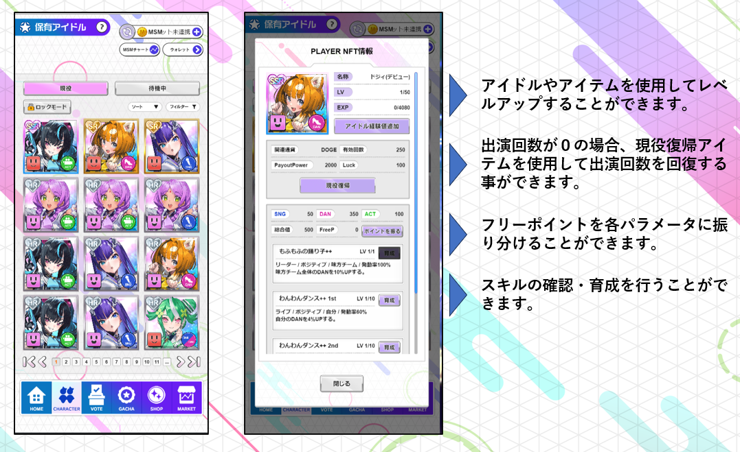 * 各キャラクターを選択すると、パラメータ等の詳細情報が閲覧でき、「レベルアップ」「現役復帰」「フリーポイント割り振り」「スキル育成」の操作ができます。