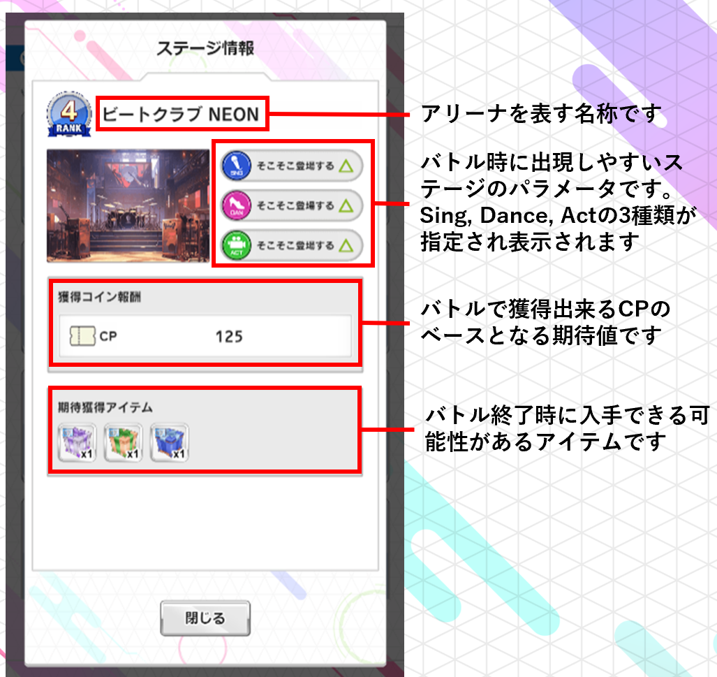 アリーナはランクやイベント状況に応じて各パラメータが指定され、上のアリーナに行くほど経験値、CPを多く獲得することができ、スキルレベルも上がりやすくなります。コンディションのスタミナ値は1回のバトルごとに定められた値を消費します。