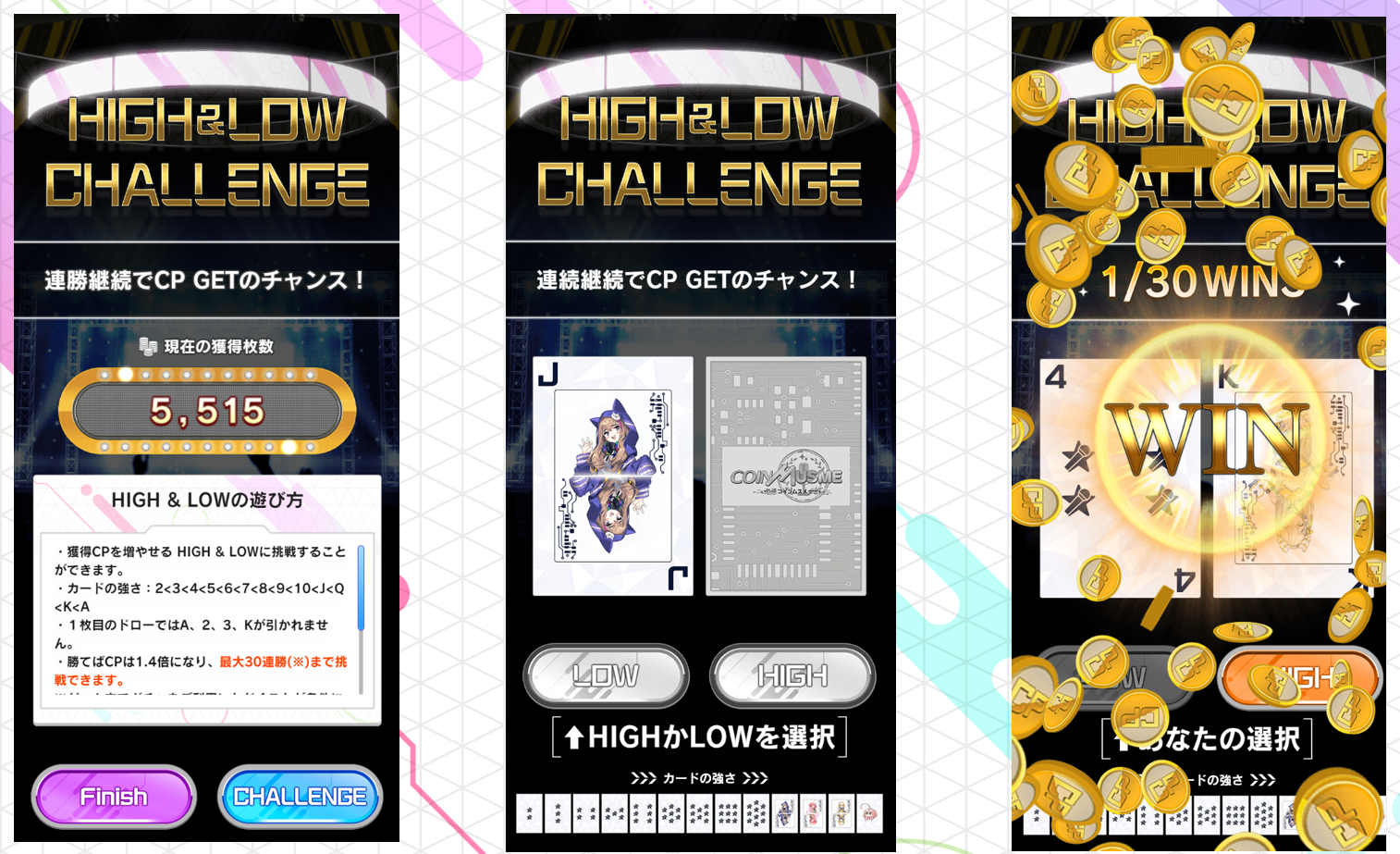 * 場に表示されたカードとプレイヤーの手札が同じ数字の場合、CPは変動せず再度カードが配布され、もう一度HighかLowを予想します。