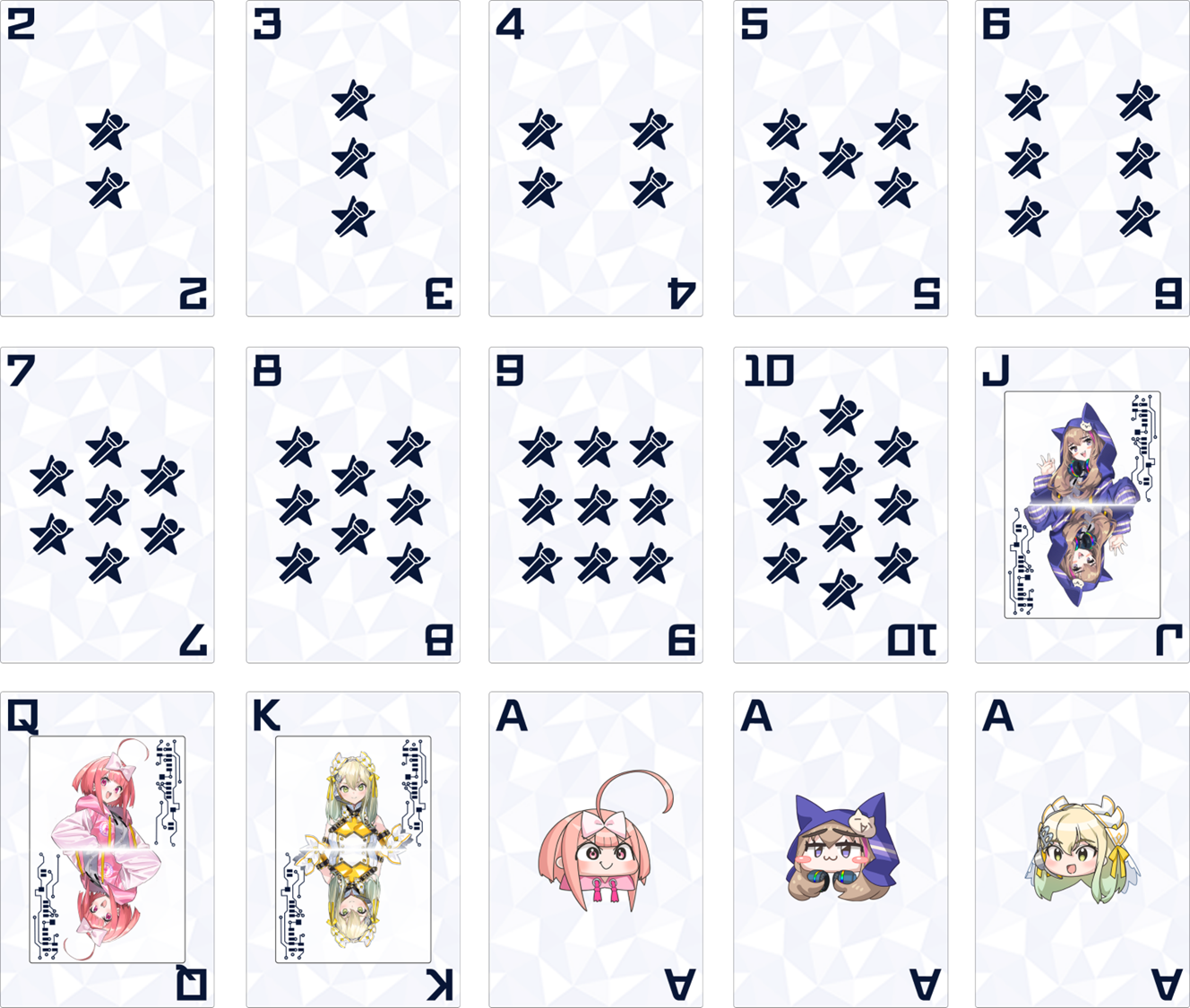 * ハイ＆ローでは、伏せられたプレイヤーの手札が、場に表示されているカードに比べて大きい（High）か小さい（Low）かを予想します。カードは以下の13種類で、2が一番小さく、Aが一番大きい判定になっています。始めに場に表示されるカードは2、3、K、Aを除く9枚で、等確率でランダムに表示されます。