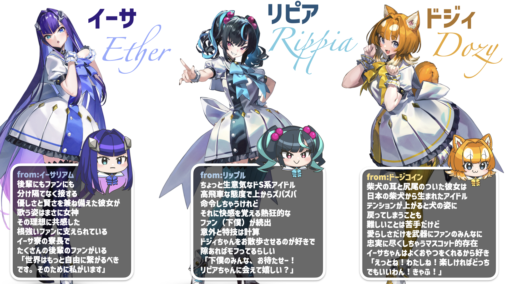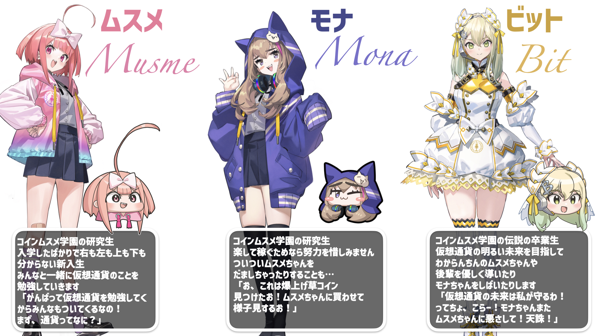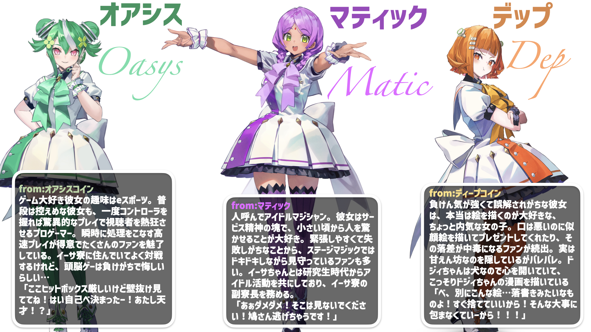 * コインムスメに登場するムスメたちは暗号資産を擬人化したアイドルです。リリース時には以下のキャラがプレイアブルになる予定です。