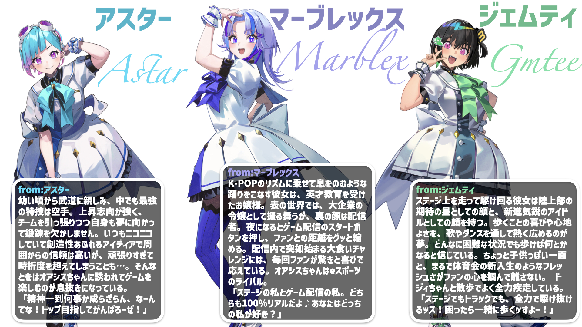 * ゲーム内では以下のキャラクターがガイド役として登場します。リリース時点ではプレイアブルではありません。
