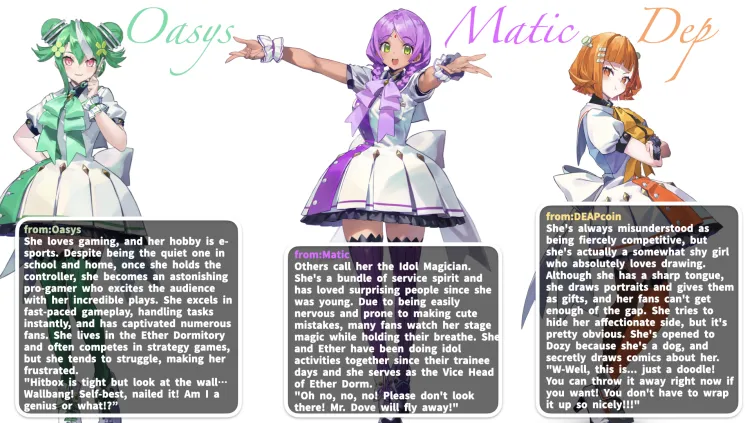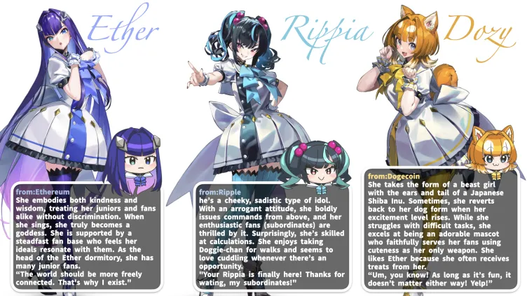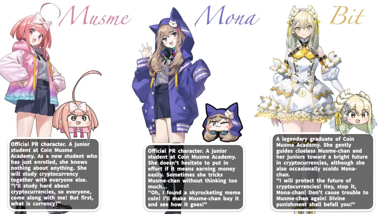 * Musme in CoinMusme are characters that are inspired by cryptocurrencies. The following characters are planned to be playable at the time of the game's release.
