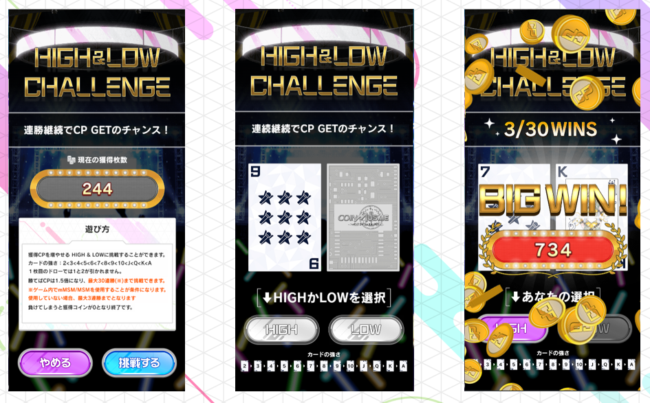 예상이 맞으면 획득한 CP가 1.4배가 되며 아레나 배틀을 종료할지 하이&로우를 계속할지 선택할 수 있습니다.하이&로우는 최대 30연승까지 이어갈 수 있습니다.